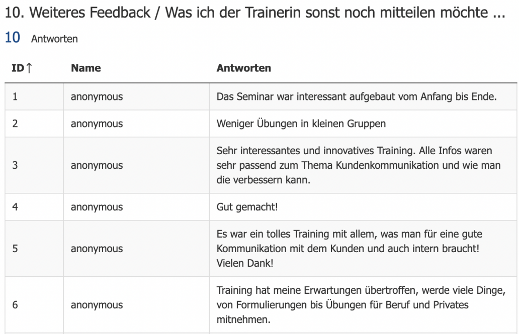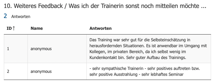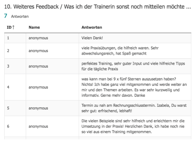 "Ein äußerst lehrreiches Seminar, bei dem viele verschiedene Methoden der Informationsvermittlung zum Einsatz kamen und die Theorie mit viel Praxis ausgereichert wurde. Die kompetente und sympathische Trainerin hat begeistert und kreativ durch das Programm geführt. Es gab immer wieder Aha-Momente, in denen man wirklich etwas nachhaltig begriffen hat. Ich kann dieses Seminar nur jedem empfehlen, der zum Emotionsmanager werden und sein Beschwerdemanagement verbessern möchte." Felia K., in Ausbildung