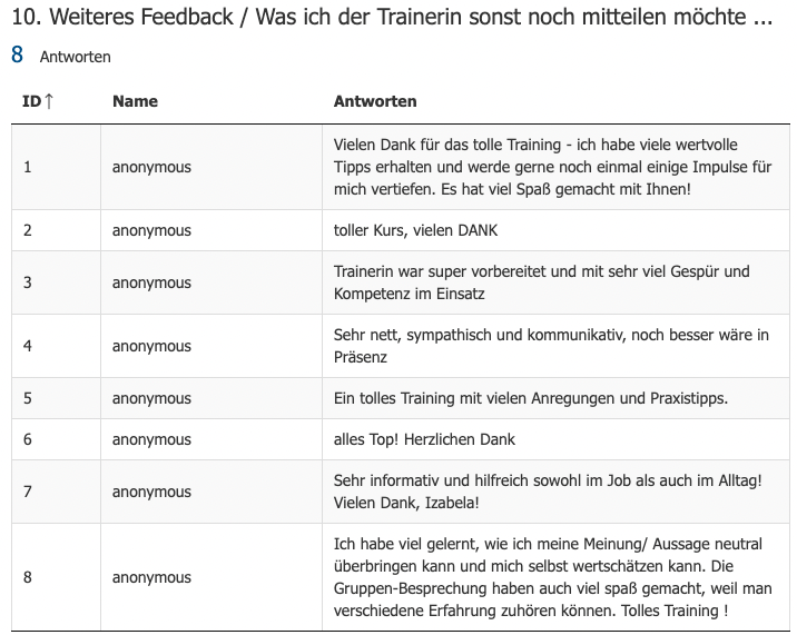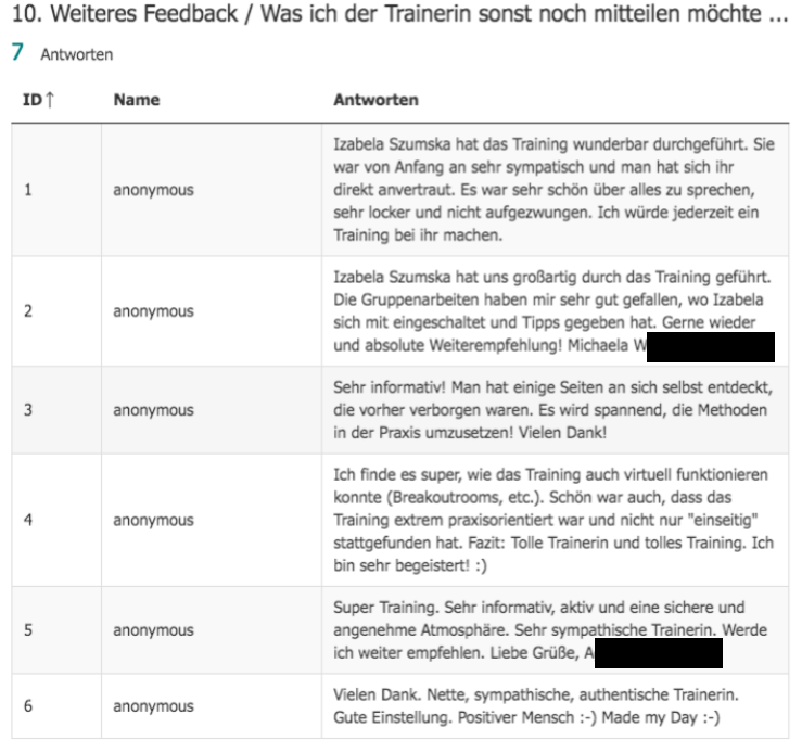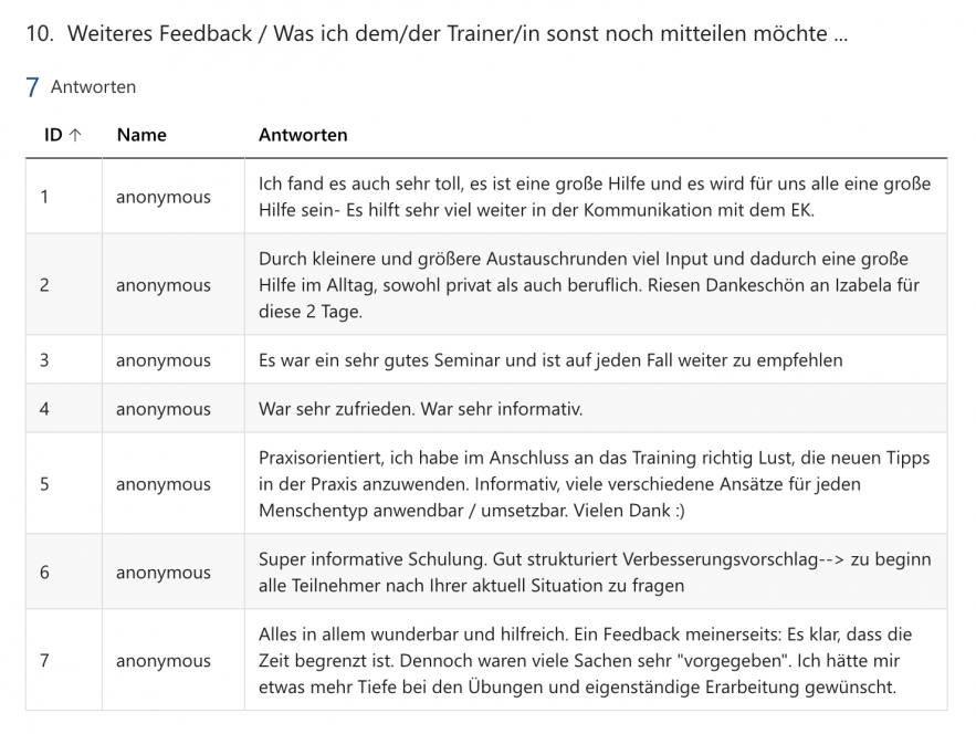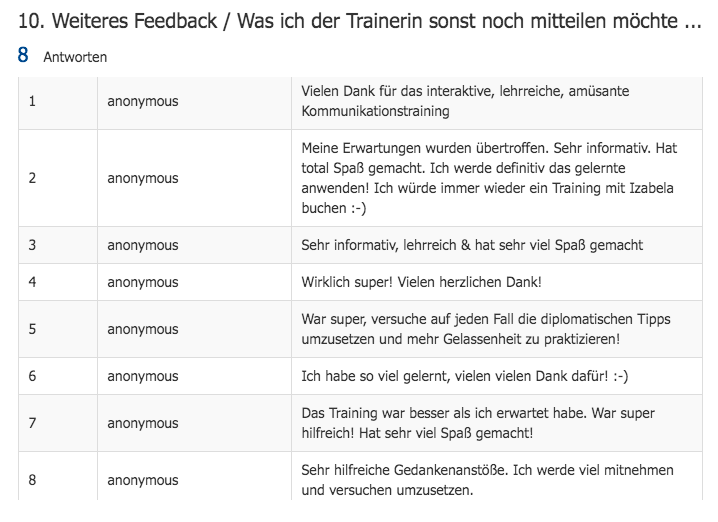 "Fantastisch! Das Seminar war praxisorientiert, informativ und interaktiv. Wir haben viel gelacht und somit kam auch keine Langeweile auf. Izabela ist eine Kommunikationsexpertin auf höchstem Niveau und schafft es auch schwierige Sachverhalte einfach und verständlich zu erklären." Lisa V., in Ausbildung