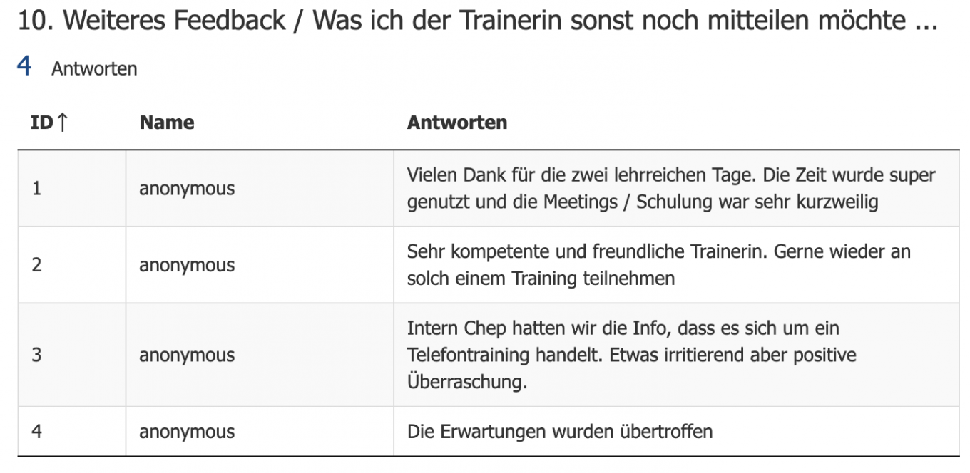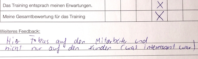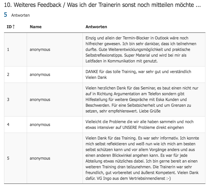 "Sehr gute Informationen für die weitere Entwicklung im Umgang mit Kunden und Endverbrauchern. Gute Mischung aus Praxis und Theorie. Insgesamt bewerte ich das Seminar mit 2.0". Andrea M., Verbraucherservice, Süßwarenbranche