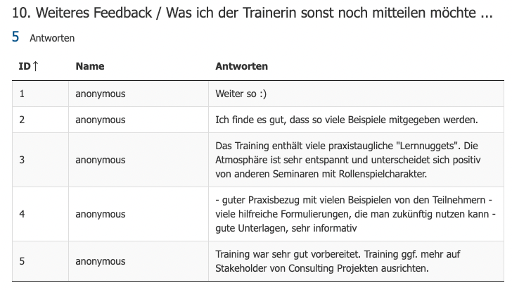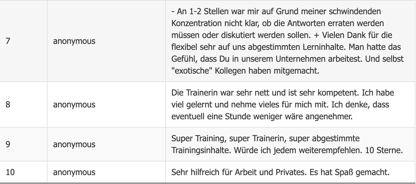 "Ein Training mit einer passenden Kombination aus praktischen Übungen gepaart mit fachlichem Wissen. Sehr souveräne Referentin (empathisch & smart) in einem tollen Schulungsmfeld (Rahmenbedingungen). Gesamtbewertung 1-." Antje S., IT-Branche, IT-Dienstleister aus Münster