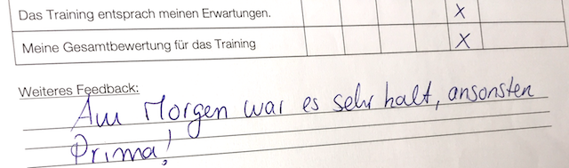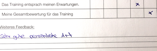 Was ich noch anmerken wollte ist, dass ich durchaus sehr positiv finde, dass man auch über das Seminar hinaus noch kleine Aufgaben gestellt bekommt, um das gelernte wieder aufzufrischen. Von meiner Seite aus nochmal ein ganz dickes Lob an Sie für die zwei schönen Tage in Münster und Ihre ausgezeichnete Vor - und Nacharbeit.